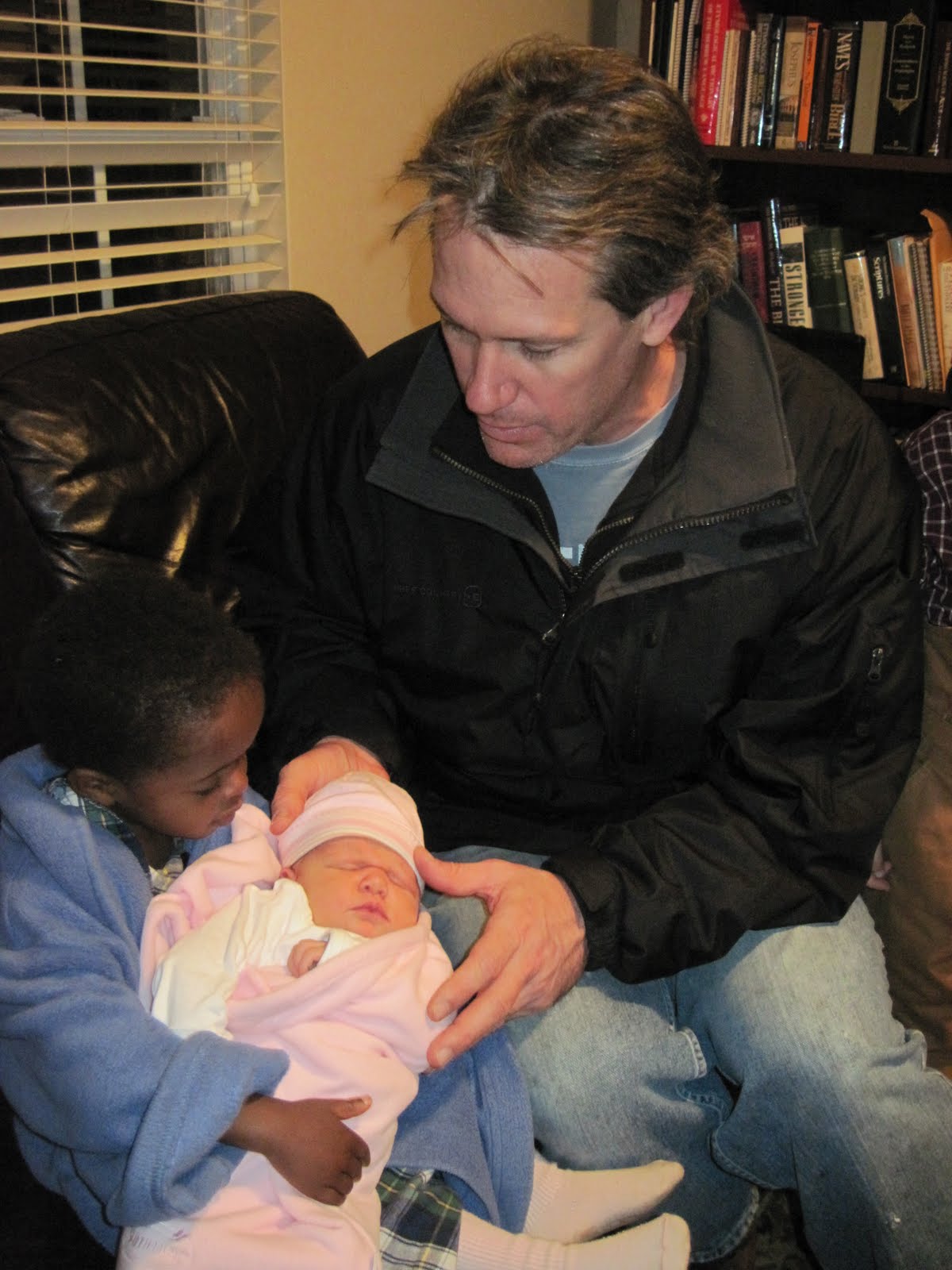"What are you going to do with it?" You might ask! Well...it was a good price for organic grass fed butter, so I thought we would experiment with it. We sold 5# to a friend who gets produce with us. We cut the rest up into large chunks. At first I thought I would weigh it out into quarter pound sticks like you get at the store, than wrap them in wax paper...that thought lasted about 45 seconds! Then I thought...OK maybe 1# chunks (like a box)...but then that became too cumbersome to get exact. So we just guessed and figured we would just measure what we needed, when we needed it. So I have 2- 5 gallon buckets sitting in the shed and on the cold back porch. A couple of pyrex containers in the fridge, and 9 pint jars of crumbs that were melted and poured off. We will probably put that on the shelf on the porch. If it warms up before we finish our butter, we will rush to put our blocks in the fridge or freezer where ever they fit best at the time. I researched canning butter, and still may play with it, for a small portion, but it not advised. So I am not sure about that. The one place where I found someone who does do it..says that she clarifies it (removes the butter fat - which creates Ghee) to can it. So we'll see.... these are all good things to know...for when we have our milk cow one day. :-)The perfect end to the day: As I was reading a long awaited email from my friend Heather, in PA since she got back from Israel...I was so excited to reconnect her after so long.... than we got a surprise visit from our friends that just had a baby girl last Sunday!!!! We have not been able to visit with them for months (for a whole host of reasons)...so it was SO GOOOOOOD to see them. Ahhh we are blessed with good friends...i am so thankful! And if that wasn't enough....we just opened a big ol' box they had wrapped up and given us... it was stuffed full of vacuum packed organic grass fed beef from their farm! YES! Here is a photo of Bric (the papa) letting Eliana hold their 10 day old baby (yet to be officially named).